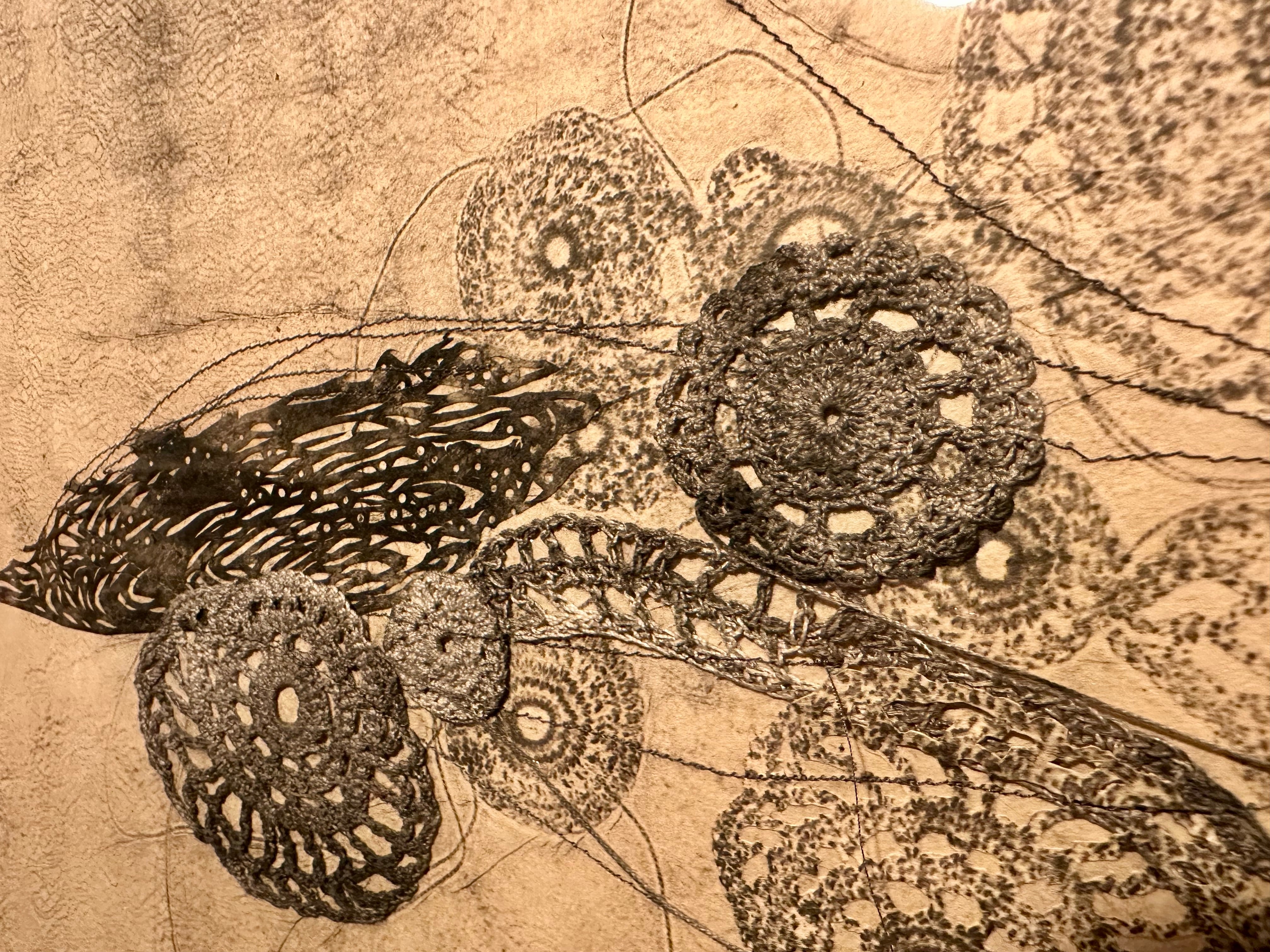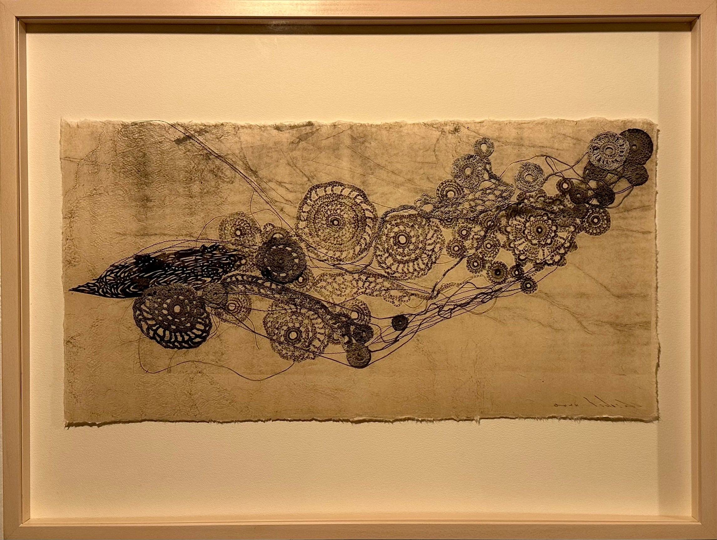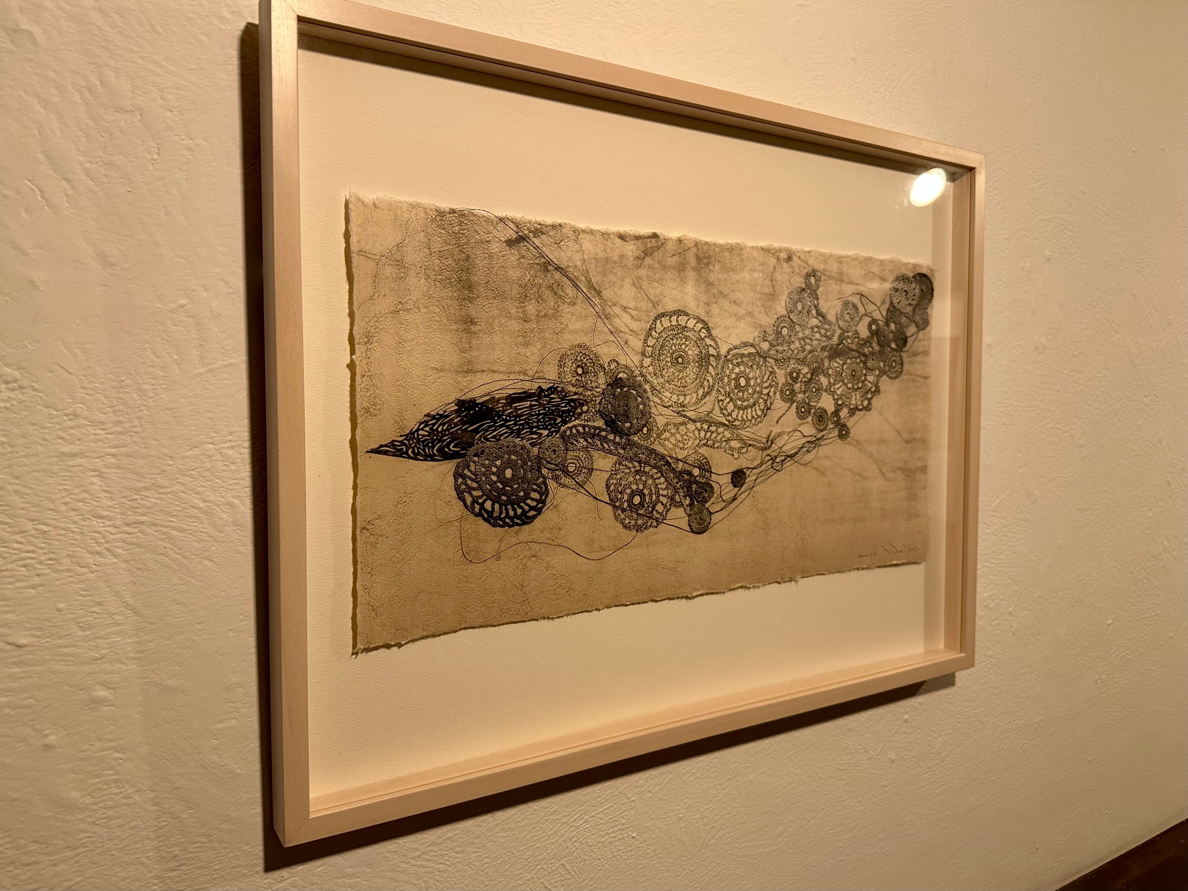 和紙にカーボンプリント、綿糸、ミシン刺繍、コラージュ