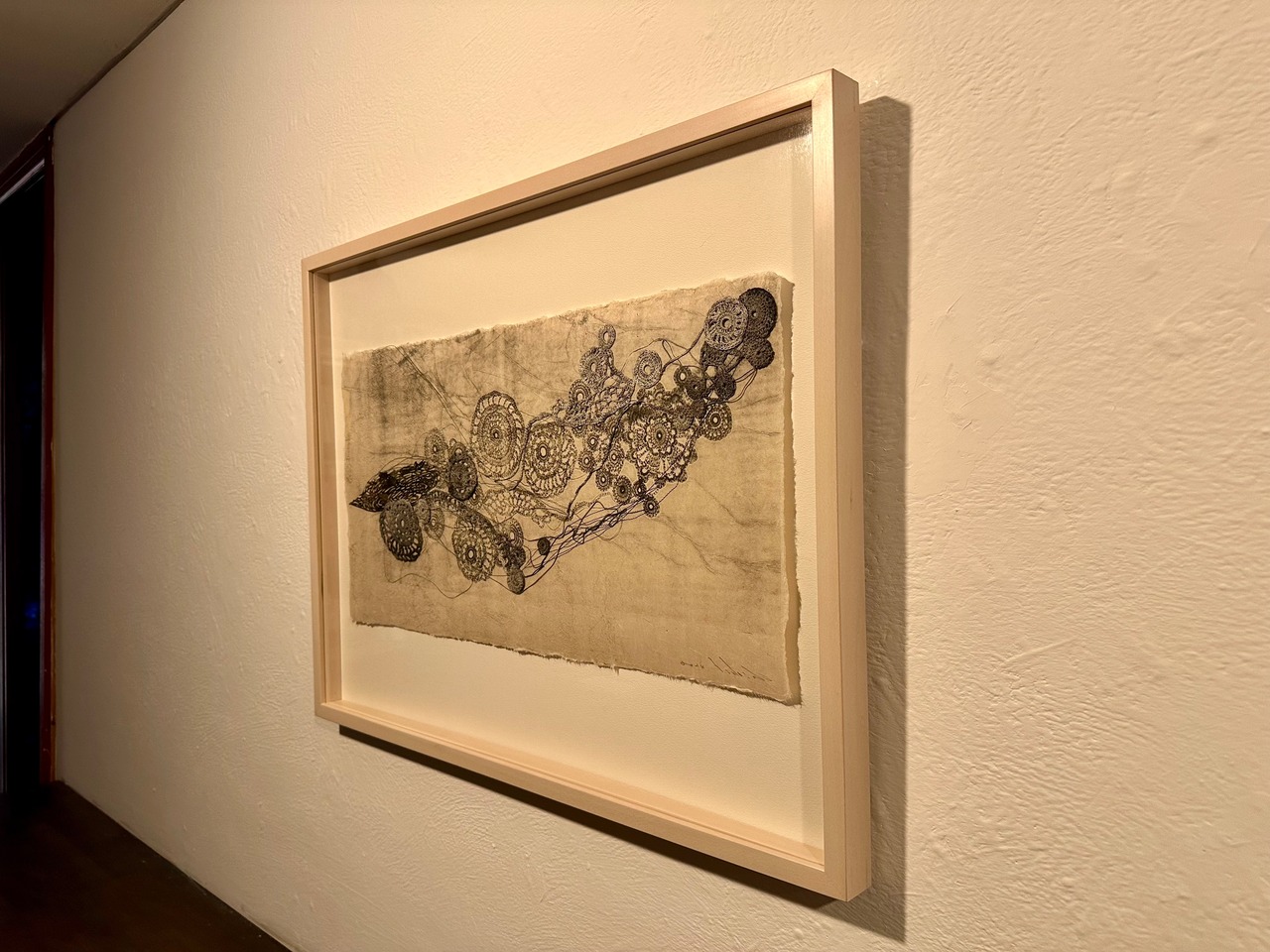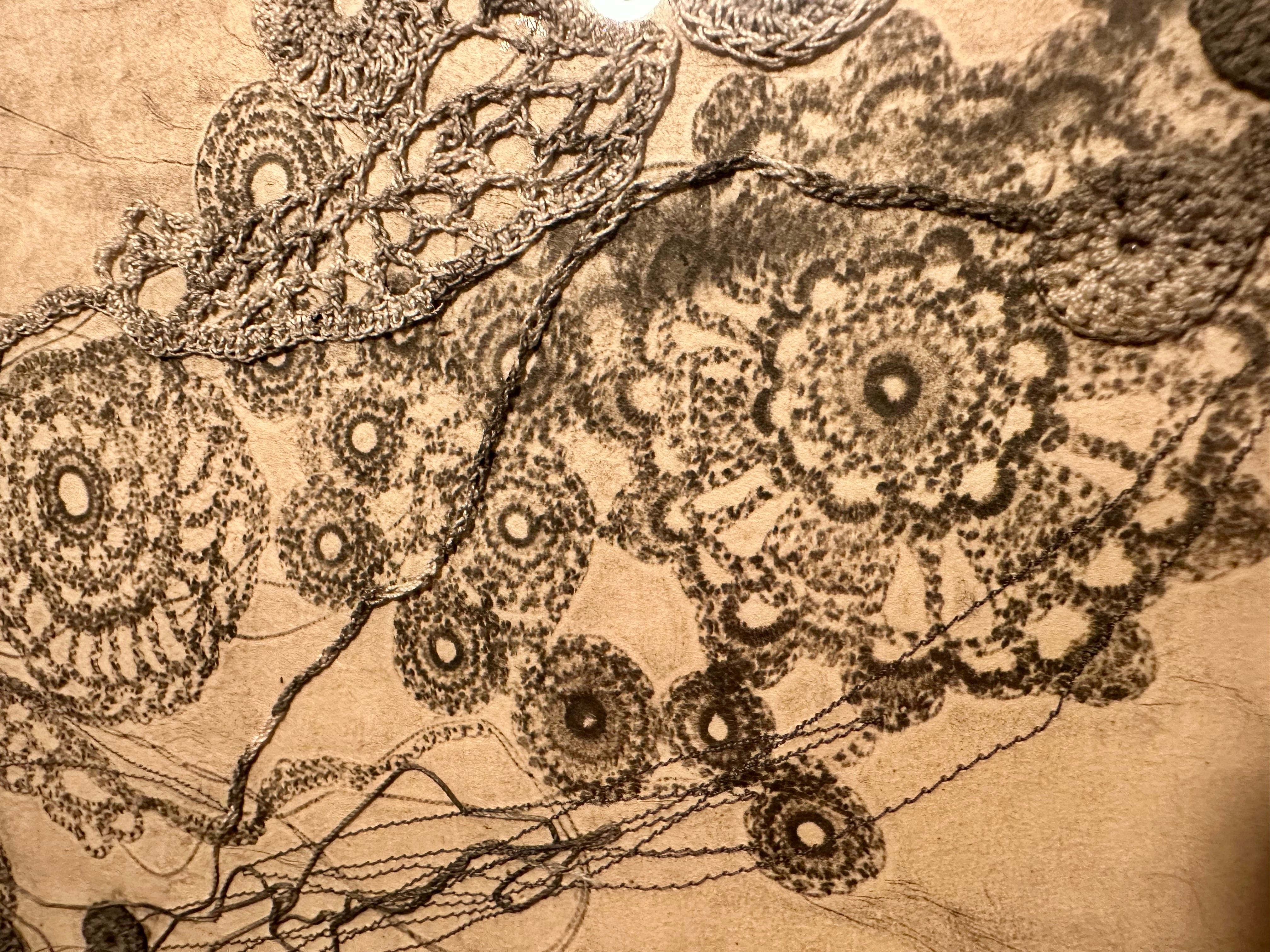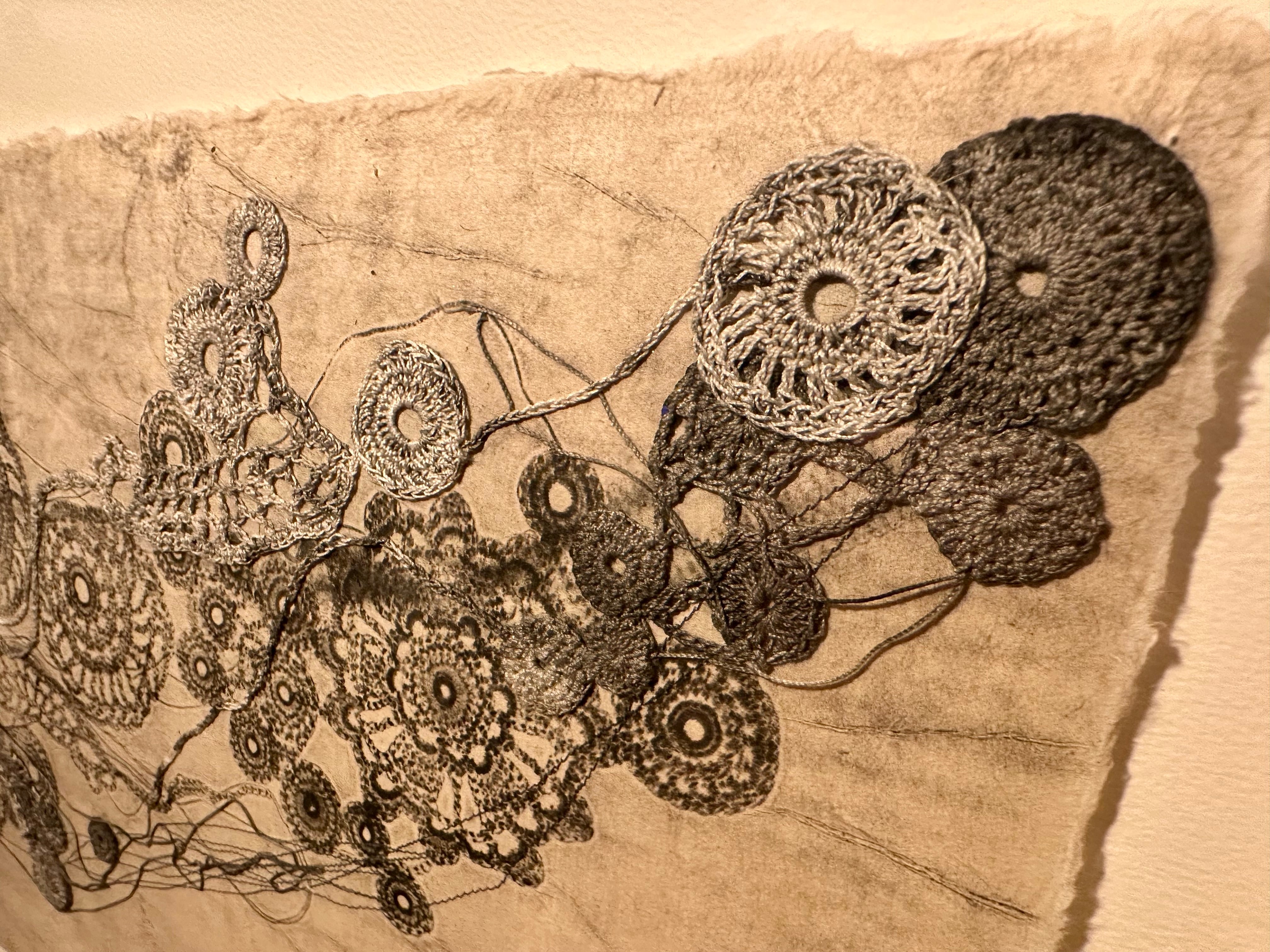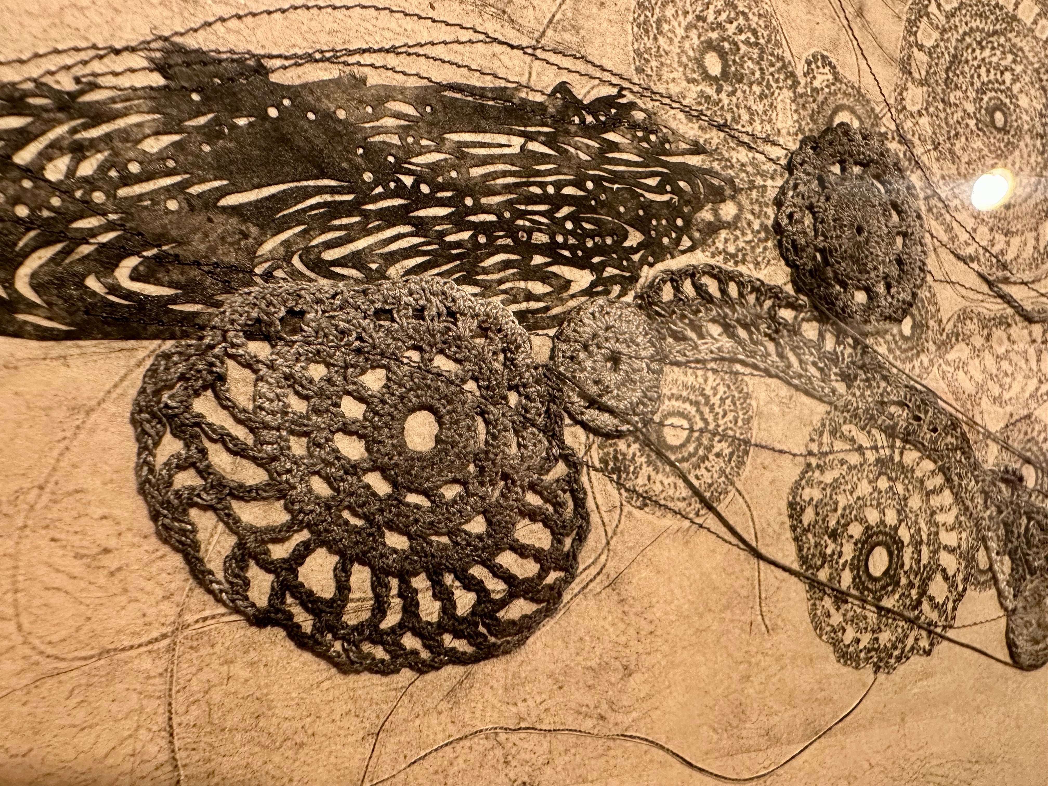和紙にカーボンプリント、綿糸、ミシン刺繍、コラージュ